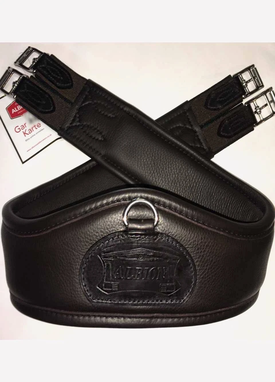 This long leather girth from Albion is stylish, smart and luxurious. It features double ended elastic which balances any pressure, whilst giving the horse much improved range of movement. It’s also great for helping to secure a slippy saddle, plus it now features a D-ring attachment to accommodate a martingale or breastplate.! This girth is shaped to eradicate any possible pinching behind the elbow, and the beautifully soft leather girth has only the horse’s comfort in mind. Excellent quality and design.