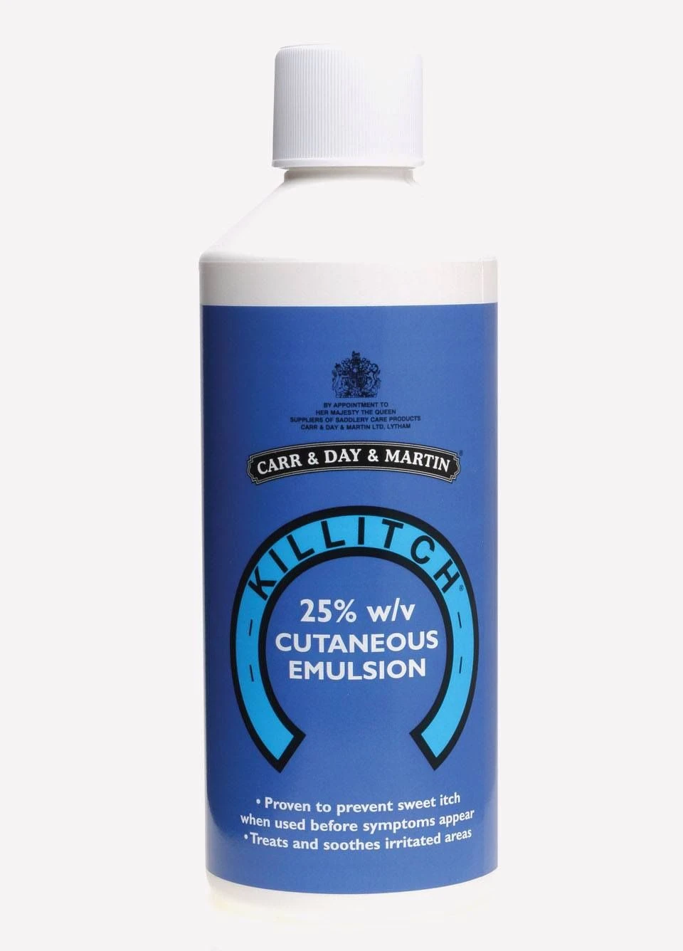 Killitch is an AVM-GSL* licensed product with active ingredient benzyl benzoate, and is a soothing lotion, specially formulated for horses. If used as a preventative measure in early Spring prior to the symptoms becoming evident, the condition may not take hold.