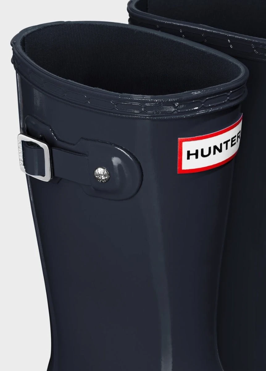 A mini version of the iconic Original Tall Boot, the Original Kids Gloss Wellington is a dream for junior explorers. This neutral navy waterproof boot is handcrafted from natural rubber with a gloss finish. Designed for adventures, our specialised kids wellies are highly resistant to wear and abrasion with a polyester lining for comfort. Reflective patches and the Hunter Original tread offer added safety so you can be confident letting them take on the elements whatever the weather.