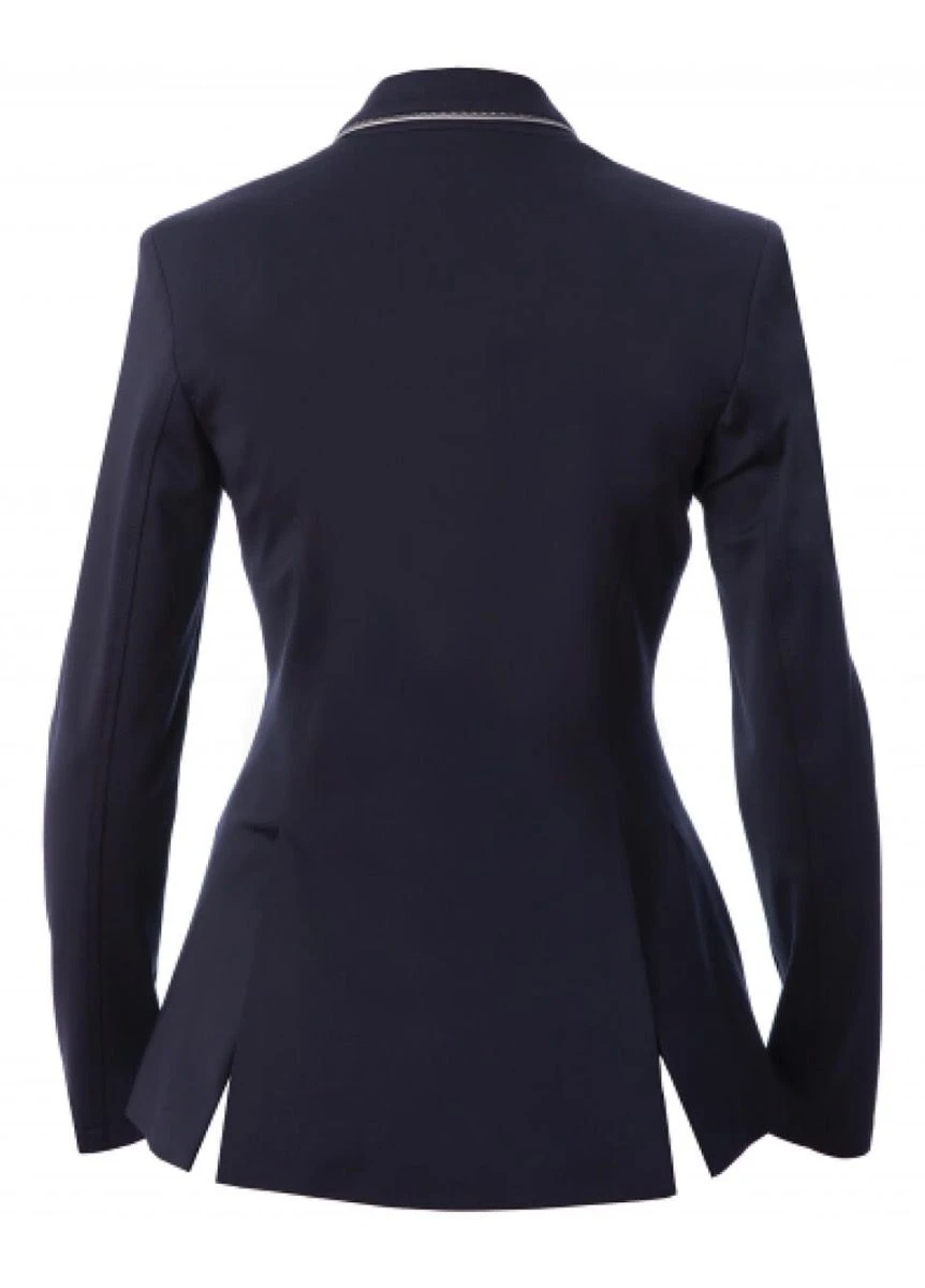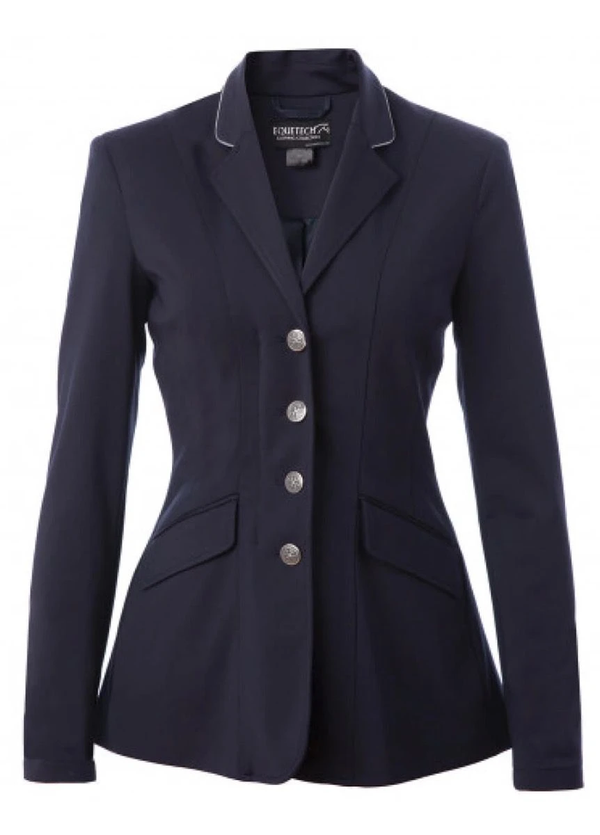 Classical tailored competition jacket with modern elements. Made from durable knitted ponte fabric with 5% Lycra added stretch and shape retention. Other features include fancy double piping to collar, Equetech exclusive crystal button, double back vents, darted contoured sleeves and concealed zip pockets. Machine washable.