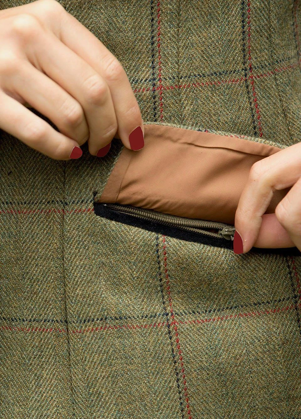 The Launton deluxe tweed jacket offers a slightly brighter look being a green Heringbone Tweed with staggered Navy and Red overcheck.