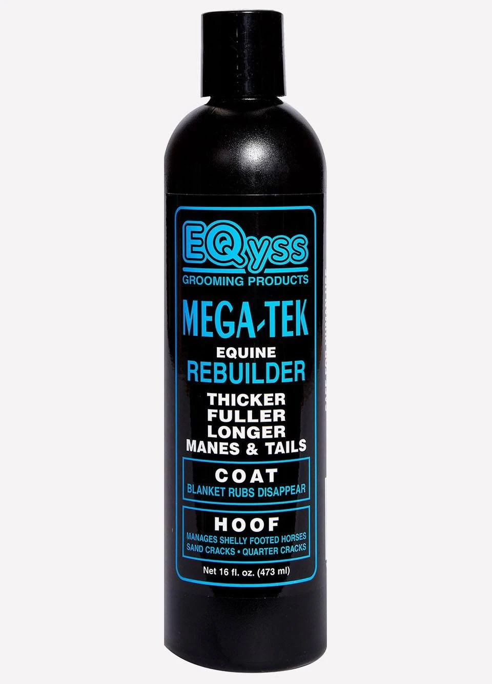 The EQyss Mega Tek Rebuilder strengthens without the use of synthetic polymers, oils, or petroleum based products. Strengthens coat hair and manes and tails. Encourages robust re-growth in areas effected by scaring and rubs – esp winter rug rubs on shoulders, withers and boot rubs. Also makes hooves grow faster and makes them 30% stronger.Â