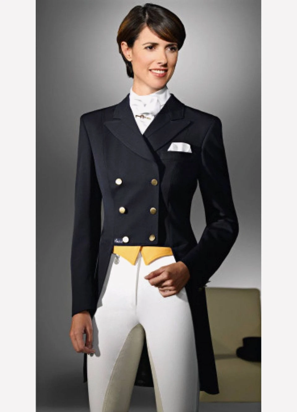 Simply wow the competition with this elegant tailcoat jacket from Pikeur. The navy colour looks oh so smart with crisp white breeches and gloves, and is perfect for adding the finishing detail to a dazzling dressage test. The tailcoat has traditional canary points, with gold buttons and weights in the tails to hold them down. It also features a lovely chest pocket, and the embroidered PIkeur logo above the front hem.