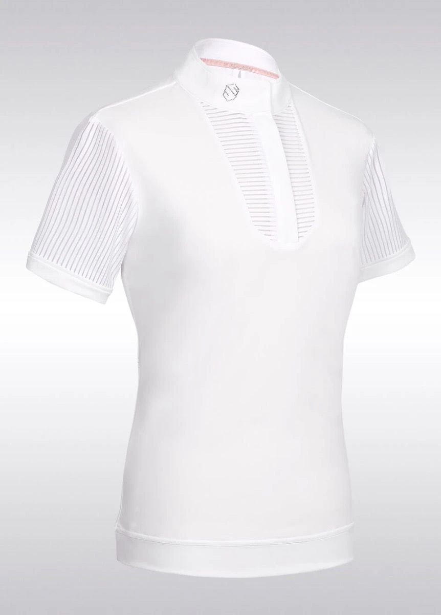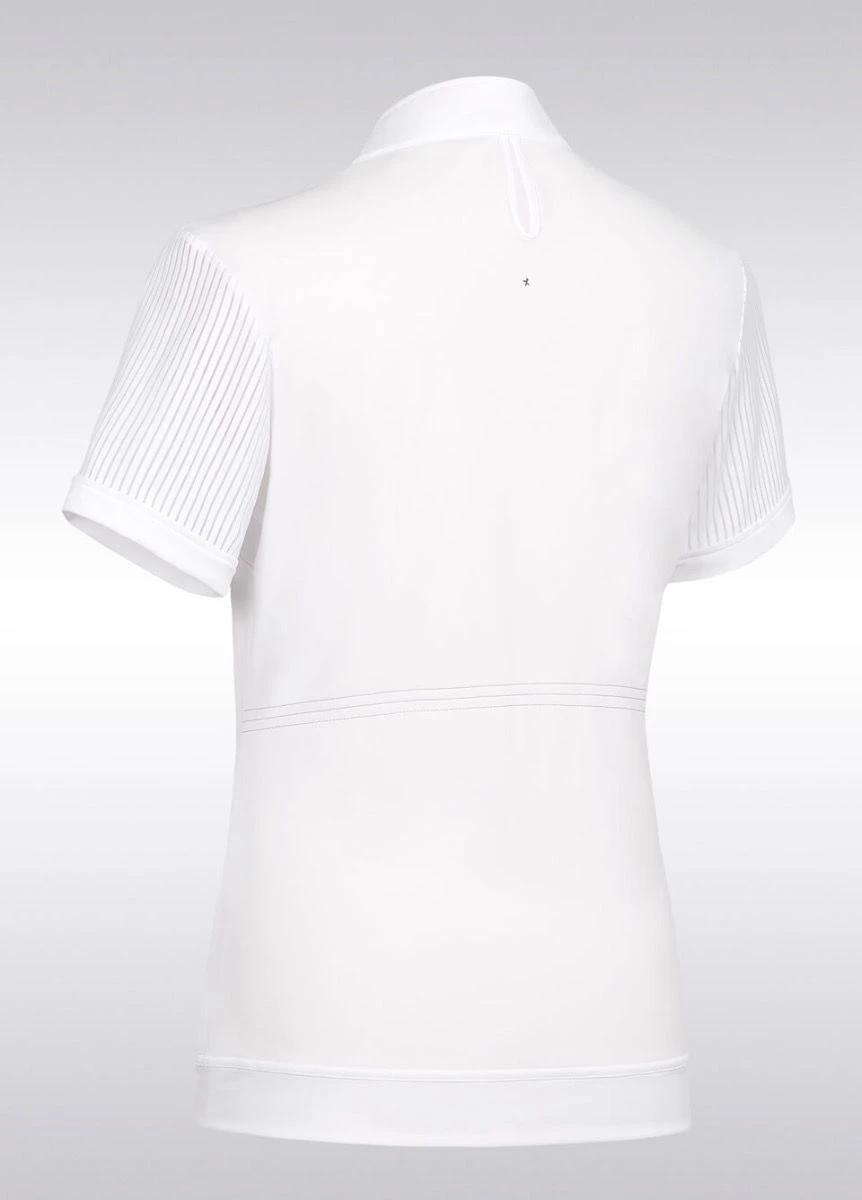 The Apolline shirt is designed with a soft high stretch fabric which provides high breathability and comfort to wear. The tailored fit allows excellent positioning when active. Thanks to the special construction of the fabric the Apolline shirt offers protection against ultraviolet rays. The collar closes with hidden small snaps and zipper. The Apolline shirt is embellished with a Swarovski® Samshield blazon on the collar and transparence fabric on the sleeves and chest providing feminity, elegance and refinement.