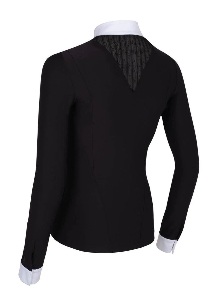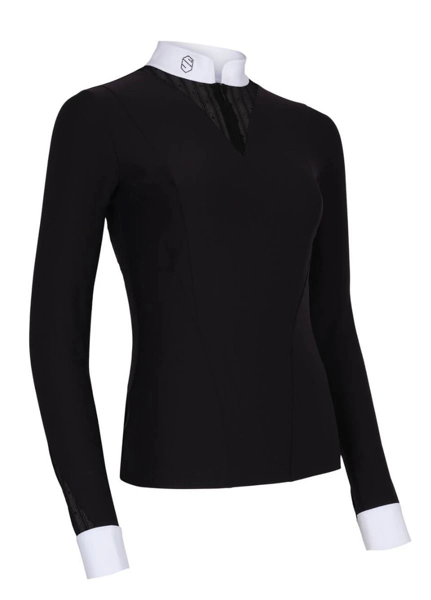 The Bianca Long sleeve Competition shirt gives an elegant silhouette to the rider with the contouring stitch lines and collar design. The lace design on the front and reverse is complimented perfectly with the Swarovski® Samshield logo and hook fastening on the collar. The material is a high stretch, breathable, technological fabric that wicks away sweat to keep the rider dry and comfortable.