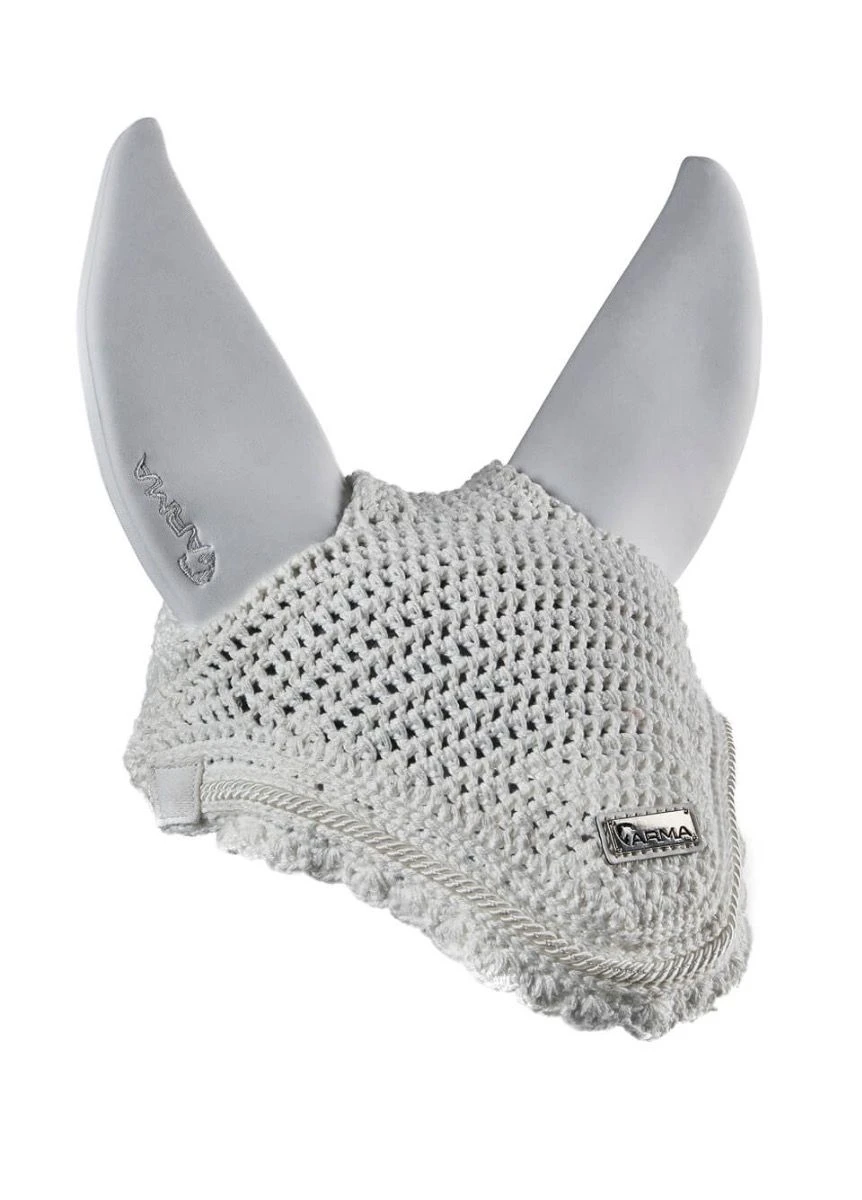 Keep distractions to a minimum, the ARMA Calm fly hood has ears that muffle sharp noises to help the horse stay focused. Designed in pliable cloth with soft coatings and a micro-cellular foam core, the ergonomic ears absorb unexpected and distracting noises comfortably. A breathable crochet bonnet is shaped a neat fit under bridles and protects against bothersome flies. Smartly finished with a twisted rope trim and a smart metal ARMA badge.