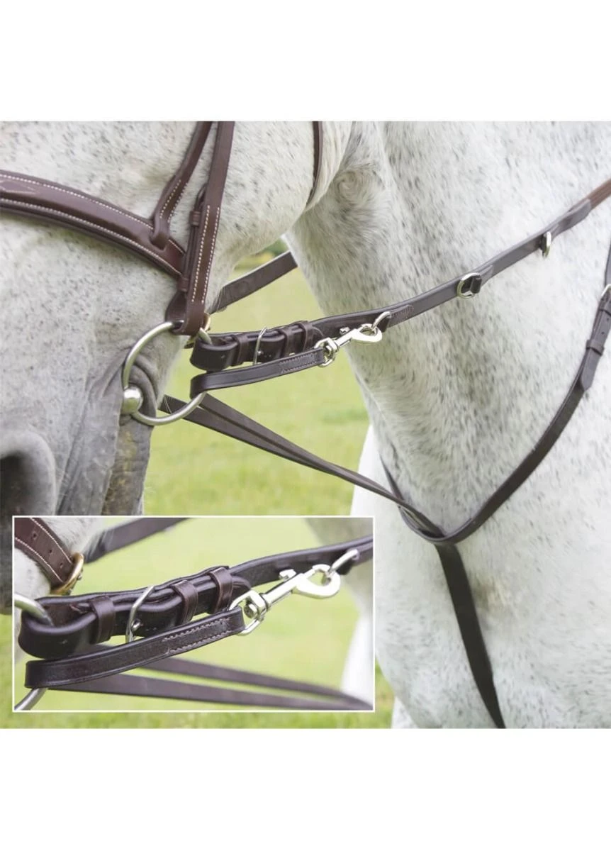 Velociti GARA market harborough in continental web and leather. Useful for ridden flat work. Pressure is applied to the bit when the horse raises his head too far, control of which is in the hands of the rider. Good for improving top line muscle. Stainless steel fittings.